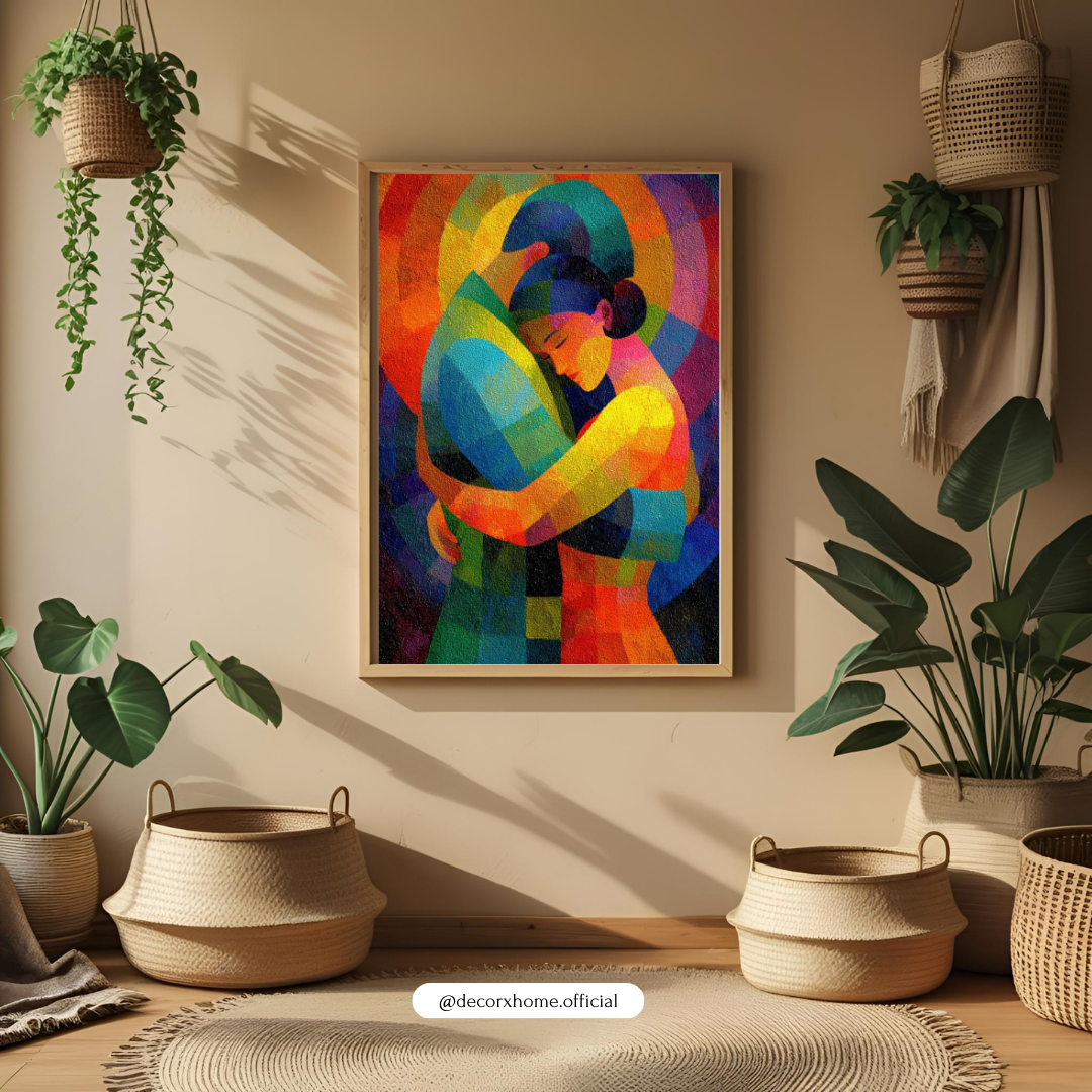 Perfect for bedrooms, living rooms, hallways, couples’ spaces, and artistic interiors, this poster adds both emotional depth and modern aesthetic charm. The mosaic-like texture and abstract shapes make it a visually engaging statement piece for any home.