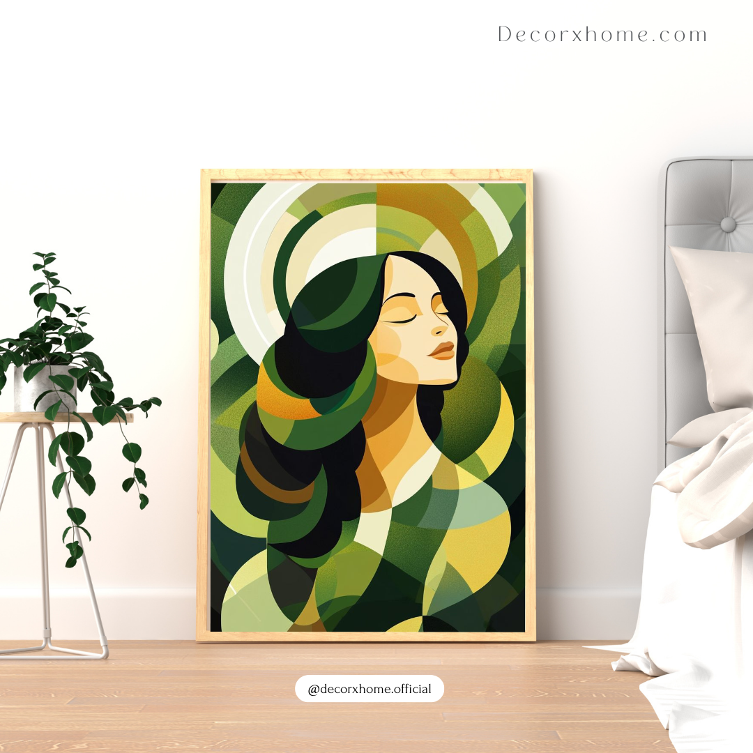 Bring calm, elegance, and artistic sophistication into your space with this Green Abstract Woman Art Poster. Featuring a serene female figure illustrated through layered geometric shapes and soothing shades of green, beige, and yellow, this artwork beautifully blends modern minimalism with expressive abstract style.